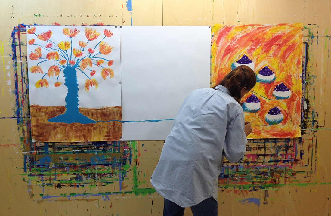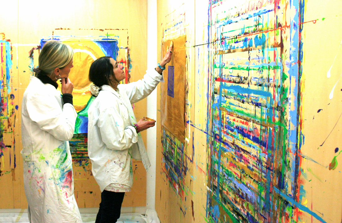 Mit beiden Beinen auf dem Boden stehend, malst Du an 1,50 x 2,00 m Holzwänden auf großen festen Papieren (70 x 100 cm) und Du kannst Deinen ganzen Körper in die Malbewegung mit einbeziehen. Es kommt auch vor, dass zusätzliche Papiere von mir angehängt werden, damit sich das Bild zu der Größe entwickeln kann, die es braucht.