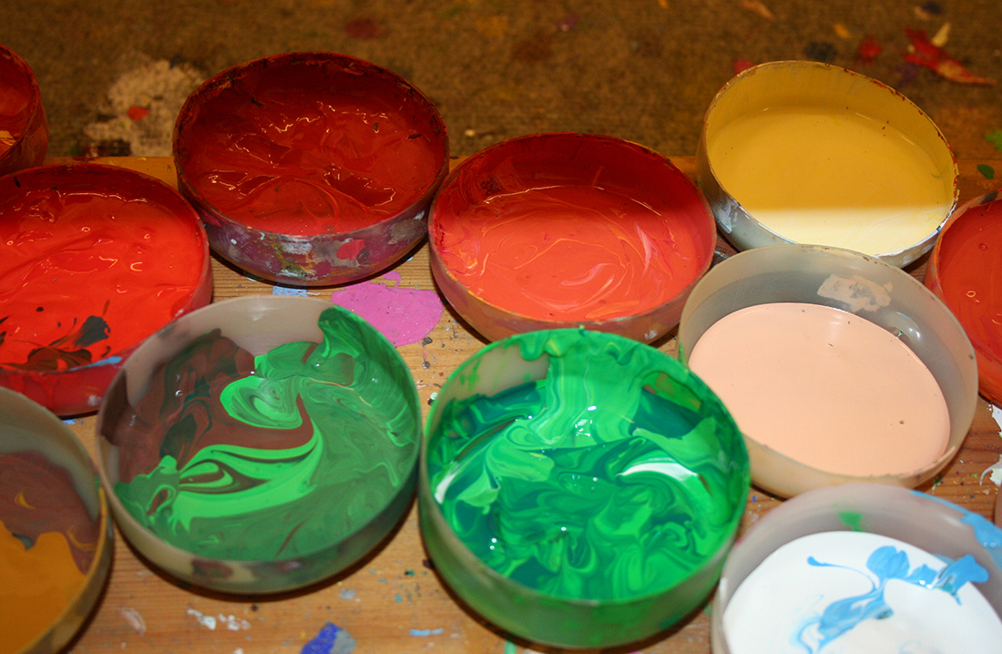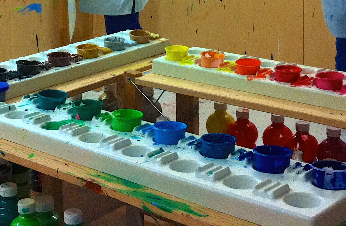 In der Mitte des Raumes steht ein Paletten-Tisch, das sogenannte „Farbenklavier“, mit 24 leuchtenden hochwertigen Tempera-Farben, die zum Malspiel einladen. Es liegen jeweils 2 Pinsel in verschiedenen Größen neben jedem offenen Farbtopf bereit. Du kannst aber auch weitere Pinselgrößen und/oder Deine Hände zum Malen verwenden!